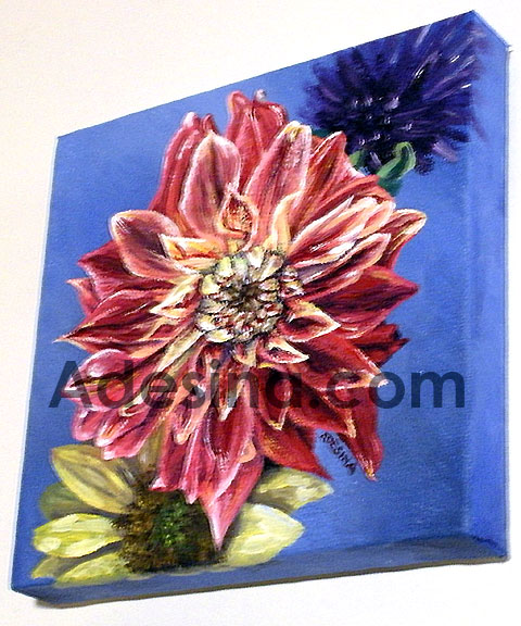 Inspired by photos I took at Pike's Place Market during a recent trip to Seattle, I chose a particularly brilliant dahlia as the focal point of the piece, whose come hither look (to me, anyway!) was purely irresistible!
